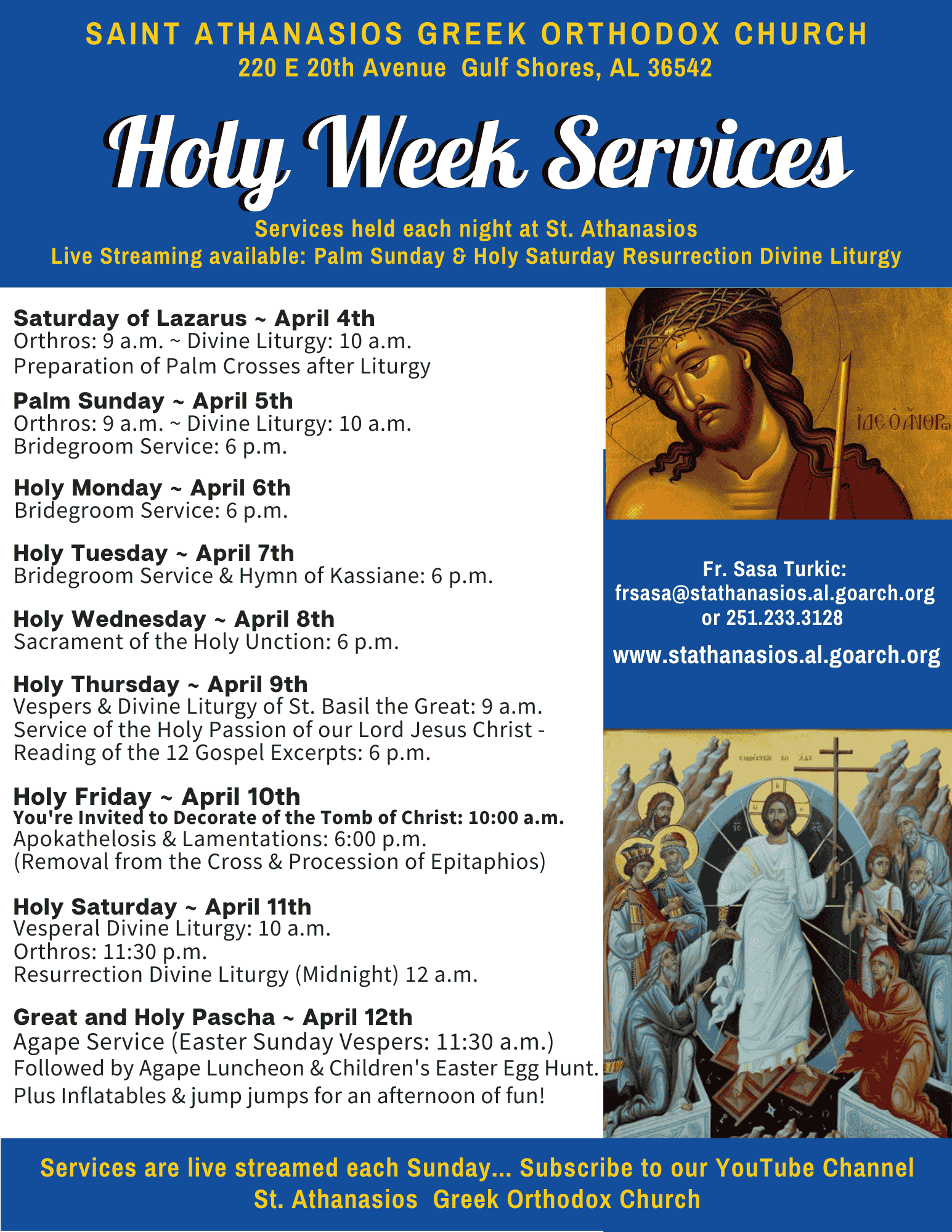 St. Athanasios Greek Orthodox Church, located in Gulf Shores, Alabama, is under the jurisdiction of His Eminence Metropolitan Sevastianos of the Greek Orthodox Metropolis of Atlanta.